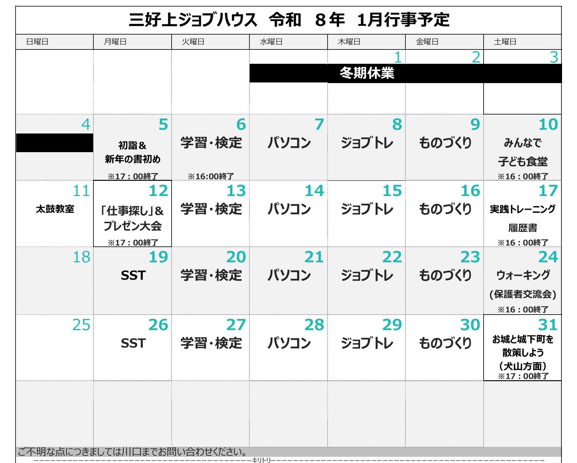 令和8年1月の予定(ジョブハウス)